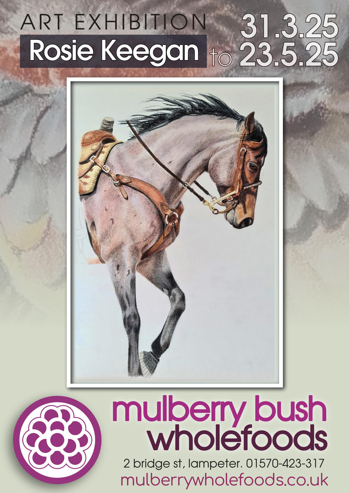 During April and May we host the intricate work of Rosie Keegan who draws with almost photorealism in colour pencil. Her subjects are birds, some pet portraits (for which she is available for commission) and a clear favourite is the horse which she carries out with classical precision, which is all the more remarkable as she has only taken up this craft since lockdown 2020.